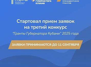 Заявки принимаются на сайте «Гранты Губернатора Кубани» (ссылка: https://grants.krasnodar.ru/) до 18:00 11 сентября.