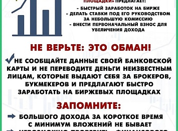 По данному факту следственным отделом ОМВД России по Белореченскому району возбуждено уголовное дела по признакам преступления, предусмотренного ч.4 ст. 159 Уголовного кодекса Российской Федерации (мошенничество). Отдел МВД России по Белореченскому району в очередной раз напоминает гражданам района не принимать участия в биржевых и инвестиционных проектах, не обладая специальными знаниями. Прежде чем решиться на вклад, изучите информацию о деятельности торговой площадки. Проверить такие организации можно на официальном сайте Центрального банка Российской Федерации.Если фирма, с представителем которой вы общались, не внесена в список, значит, она не может предоставлять брокерские услуги на бирже. Не стоит открывать брокерский счет по ссылкам, которые присылают по почте или в мессенджерах. Любые подозрительные предложения следует игнорировать. Будьте бдительны и внимательны!