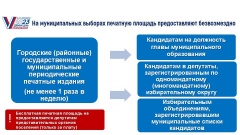 На муниципальных выборах, назначенных на единый день голосования 10 сентября 2023 года, зарегистрированным кандидатам, избирательным объединениям, зарегистрировавшим муниципальные списки кандидатов, предоставляется бесплатное эфирное время и бесплатная печатная площадь для проведения предвыборной агитации в СМИ.