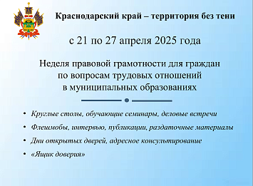 Проведение недели правовой грамотности «Краснодарский край – территория без тени» с 21 апреля по 27 апреля 2025 года