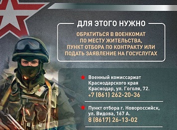Более подробную и актуальную информацию о поступлении на контрактную службу в Вооруженные Силы Российской Федерации можно получить по телефонам +7(86155)222-50, +7(86155)317-18 или в военном комиссариате Белореченского муниципального района Краснодарского края по адресу: г. Белореченск, ул. Таманской Армии, 204.