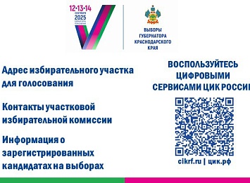 Для избирателей доступны цифровые сервисы ЦИК России, которые позволяют получить информацию о проходящих выборах, о включении в список избирателей на избирательном участке, об избирательных комиссиях, об участвующих в выборах кандидатах, а также о результатах выборов. Доступ к цифровым сервисам осуществляется с помощью официального сайта ЦИК России, который доступен по указанной ссылке Кроме того, местонахождение участковых избирательных комиссий можно найти с помощью специального сервиса, который доступен по данной ссылке. Приглашаем избирателей посетить официальный сайт избирательной комиссии Краснодарского края, на котором размещена актуальная информация об организации и проведении выборов в баннере «Всё о выборах в дни голосования 12-13-14 сентября 2025». Приглашаем принять участие в выборах!