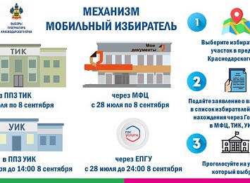 Напоминаем, что продолжается приём заявлений о включении в список избирателей по месту нахождения (механизм «Мобильный избиратель») на выборах Губернатора Краснодарского края. Заявление о включении в список избирателей для голосования по месту нахождения можно подать с 28 июля по 8 сентября 2025 года в территориальной избирательной комиссии, через МФЦ или портал Госуслуг. С 3 сентября до 14:00 8 сентября 2025 года заявления также будут оформляться в участковых избирательных комиссиях. В соответствии с установленным графиком работы территориальные избирательные комиссии будут принимать заявления в будние дни с 14:00 до 18:00 часов, в выходные дни – с 10:00 до 14:00 часов. В участковую избирательную комиссию для подачи заявления можно будет обратиться в будние дни с 16:00 до 20:00, в выходные дни – с 10:00 до 14:00, 8 сентября – с 10:00 до 14:00. Заявления в офисах МФЦ принимаются согласно графику работы учреждения.