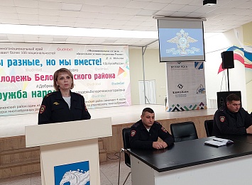 В рамках спецпроекта МВД России «Будь в форме» в Белореченске на базе Управления по делам молодёжи полицейские проводят встречу с школьниками и студентами, рассказывая присутствующим о представителях разных специальностей, востребованных в органах внутренних дел. Цель таких мероприятий – предоставление информации о работе сотрудников органов внутренних дел и привлечение выпускников на службу в полицию, а также ВУЗы системы МВД. Такие встречи позволяют выпускникам определиться с выбором будущей профессии, а также подготовиться к поступлению в профильные высшие учебные заведения.