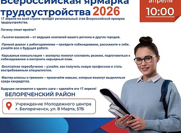 В городе Белореченске пройдёт главное кадровое событие страны в 2026 году — Всероссийская ярмарка трудоустройства «Работа России. Время возможностей».